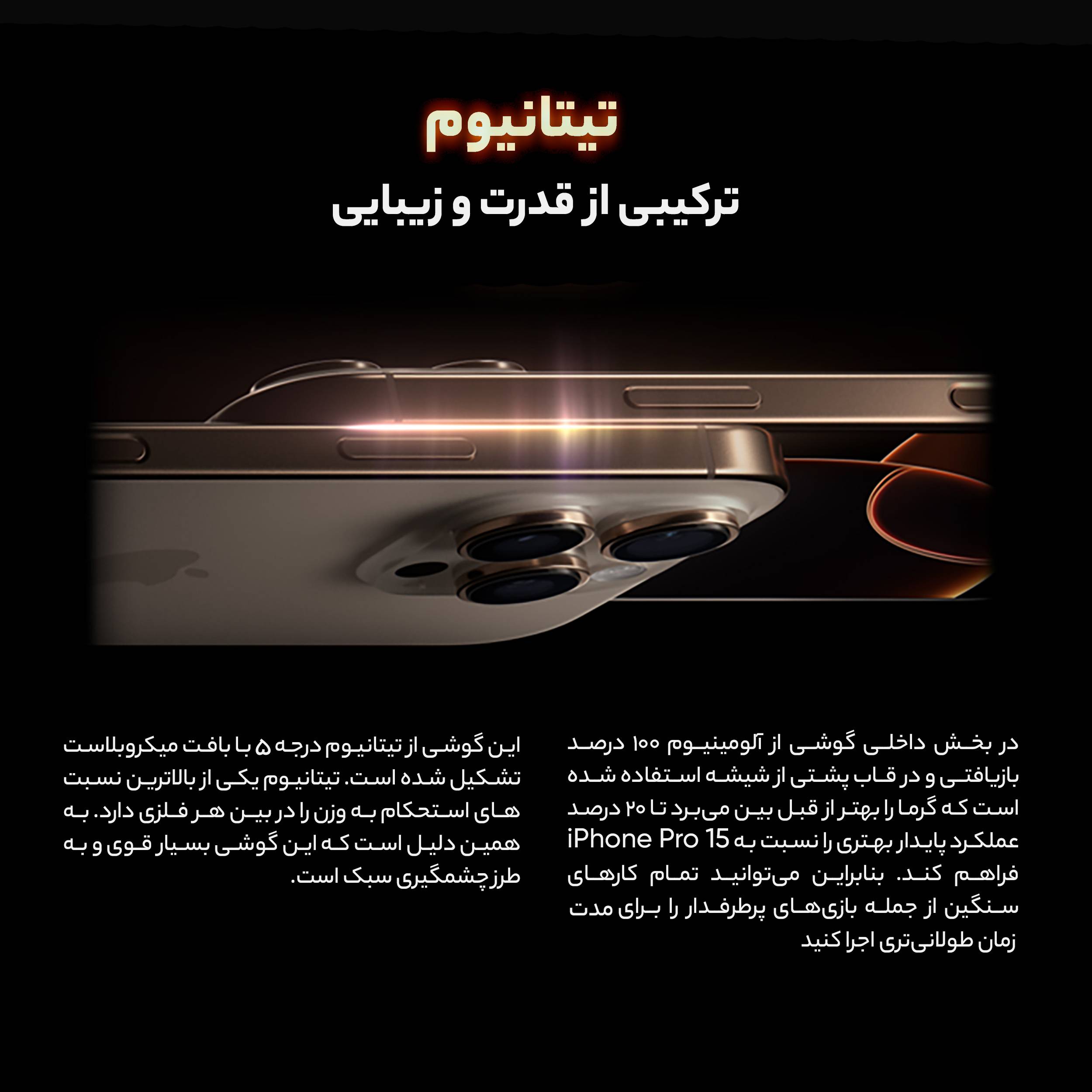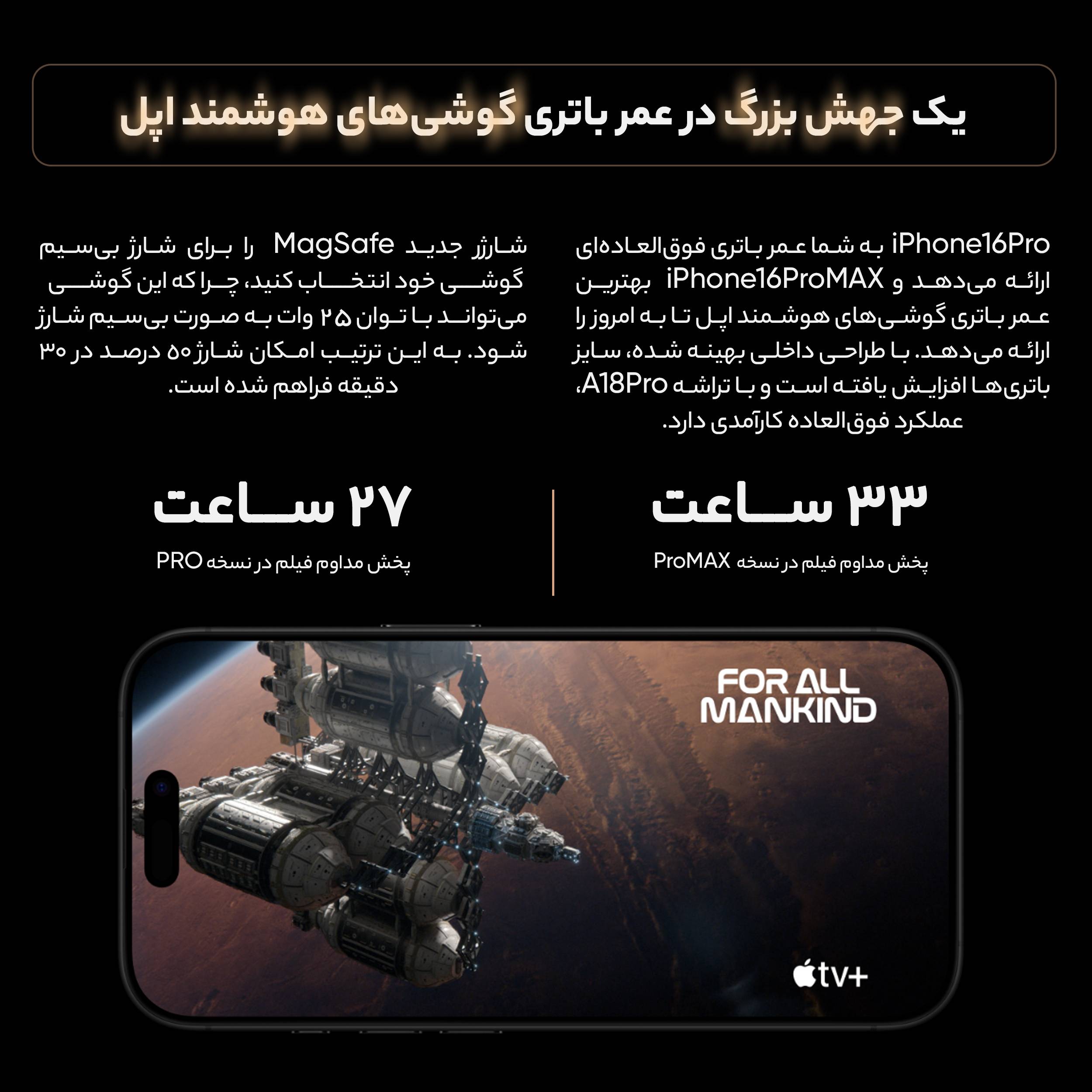 آیفون 16 پرو مکس، جدیدترین شاهکار اپل، با طراحی شیک، دوربینهای بینظیر و عملکردی فوقالعاده، استانداردهای جدیدی را برای گوشیهای هوشمند تعریف میکند. نمایشگر 6.9 اینچی Super Retina XDR OLED با وضوح بالا و نرخ نوسازی 120 هرتز، تجربه بصری کمنظیری را ارائه میدهد و بدنه مقاوم از جنس شیشه و تیتانیوم، زیبایی و دوام را در کنار هم به ارمغان میآورد. چیپست قدرتمند A18 Bionic با فناوری 3 نانومتری، به کاربران امکان میدهد تا بازیها و اپلیکیشنهای سنگین را به راحتی اجرا کنند. دوربینهای 48، 12 و 48 مگاپیکسلی این گوشی، به ویژه دوربین تلهفوتو با زوم 5 برابری اپتیکال، تصاویری خیرهکننده و ویدیوهایی با کیفیت سینمایی ثبت میکنند. باتری 4685 میلیآمپر ساعتی با پشتیبانی از شارژ سریع هم به صورت باسیم و هم به صورت بیسیم، طول عمر بالایی داشته و شارژدهی بسیار خوبی دارد.